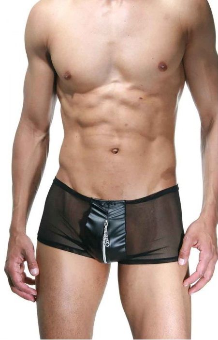 Мужские трусы-хипсы из гладкого материала, имеющие спереди гладкую вставку с молнией. По бокам и на ягодицах использована полупрозрачная ткань.