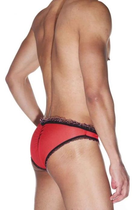 Мужские трусы-слипы из тонкой полупрозрачной ткани, со сборкой на ягодицах. Окантованы двойной рюшей.