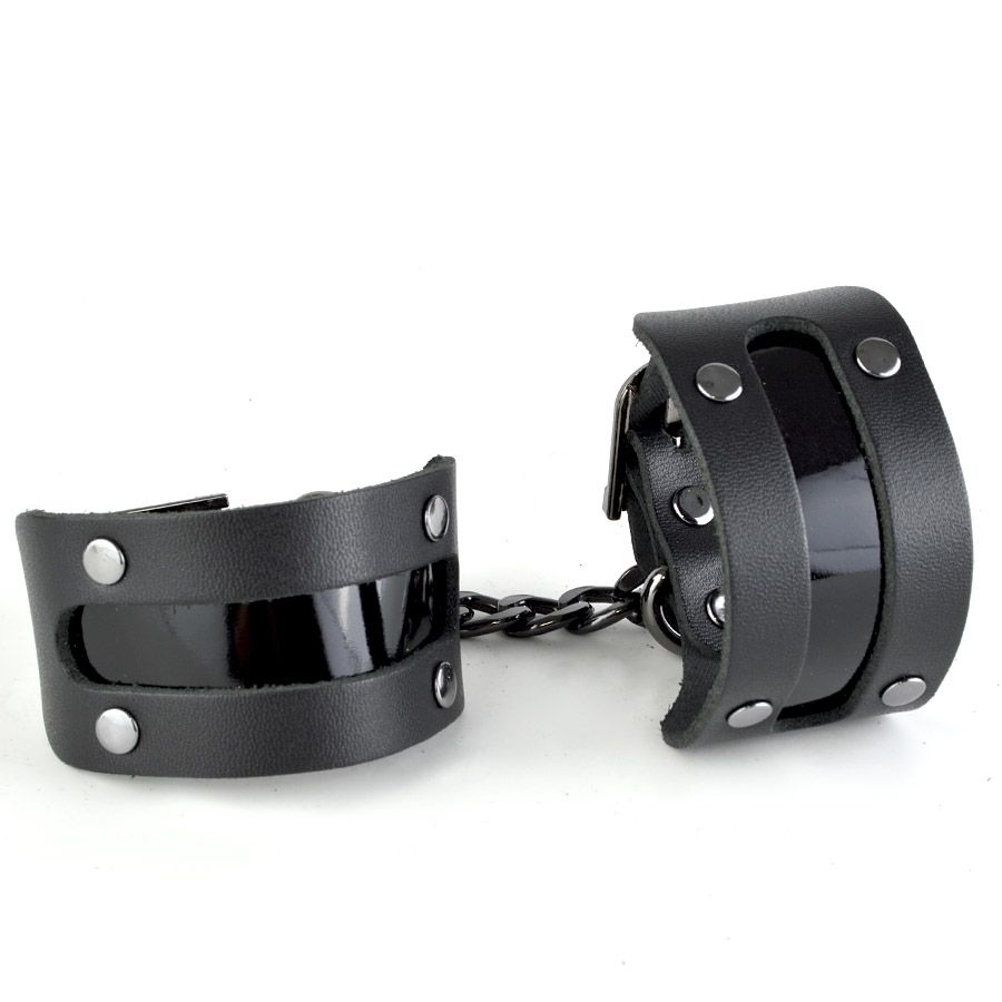 Наручники изготовлены из натуральной кожи и декорированы яркой вставкой из лаковой кожи. Общая длина наручников - 25 см. Ширина манжет - 4 см.
