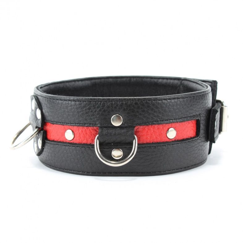 Стильный ошейник с красной полосой и металлическими заклепками обязательно понравится любителям БДСМ-игр. К пряжке можно пристегнуть поводок или наручники.